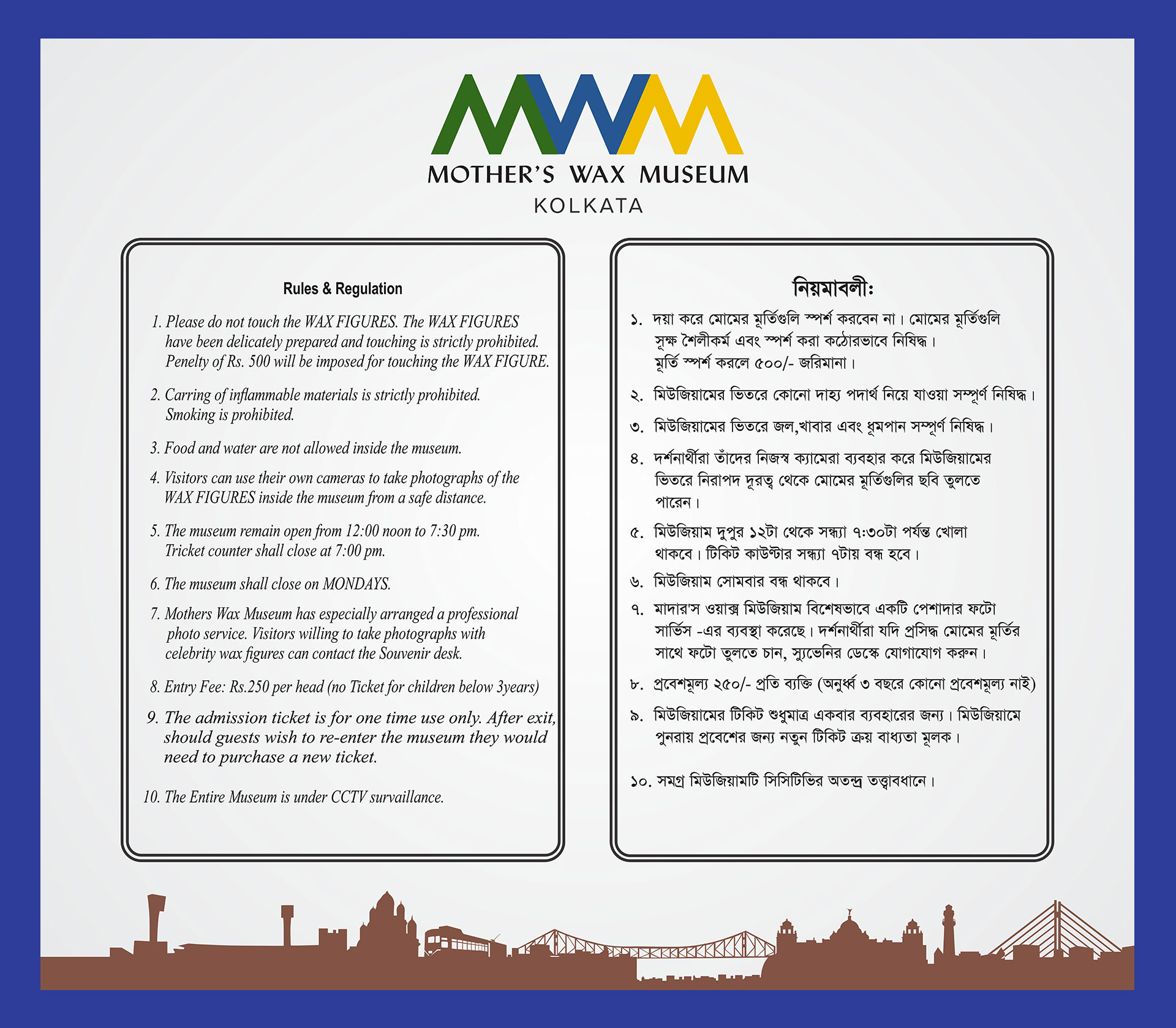Rs. 150/- (Rupees One Hundred Fifty only) per head on Saturdays, Sundays and State holidays and Rs. 100/- (Rupees One Hundred only) per head on all other days.(No ticket for children below 3 years)